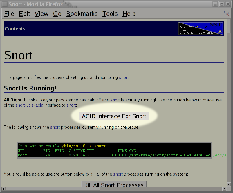 Being able to start snort with just a few mouse clicks isn't all that impressive if you don't realize what its doing. Fortunately, the Network Security Toolkit comes bundled with the php-base package from http://secureideas.sourceforge.net/.