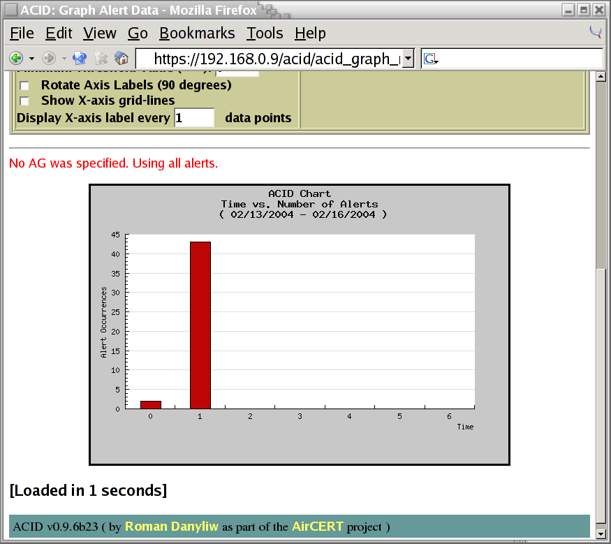 The php-base interface rewards my efforts by presenting me with a bar chart showing the number of alerts per day. This is shown in the screen shot below: