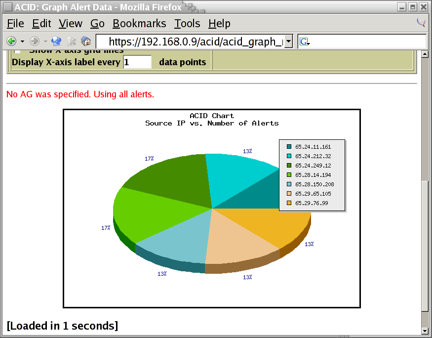 The pie chart presented shows me that there were seven source IP addresses that scanned my system at least three times. I really like how the key shows the actual IP address associated with each pie section: