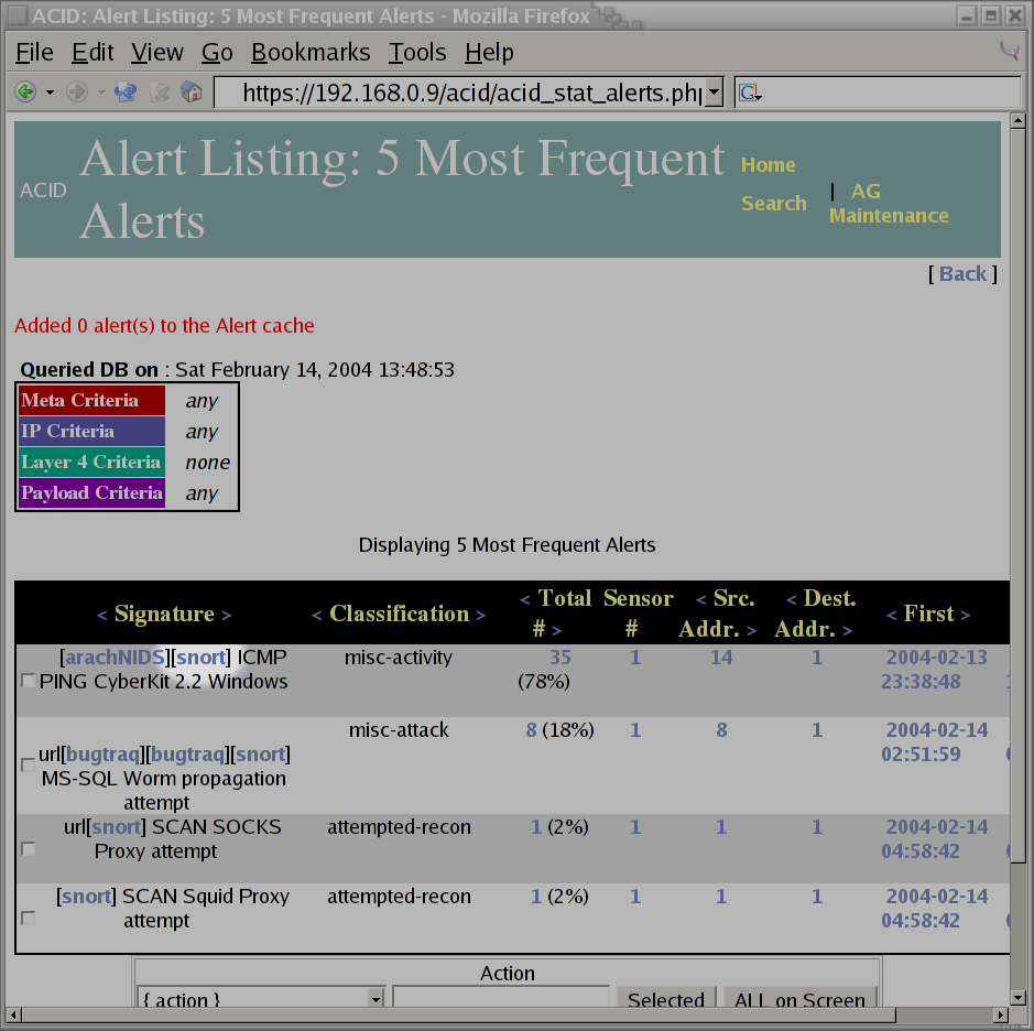 Once back at the main page, we will see a report of snort alerts which have been triggered since we started snort. If you are on a fairly secure local network, you should see a minimal number of alerts.
